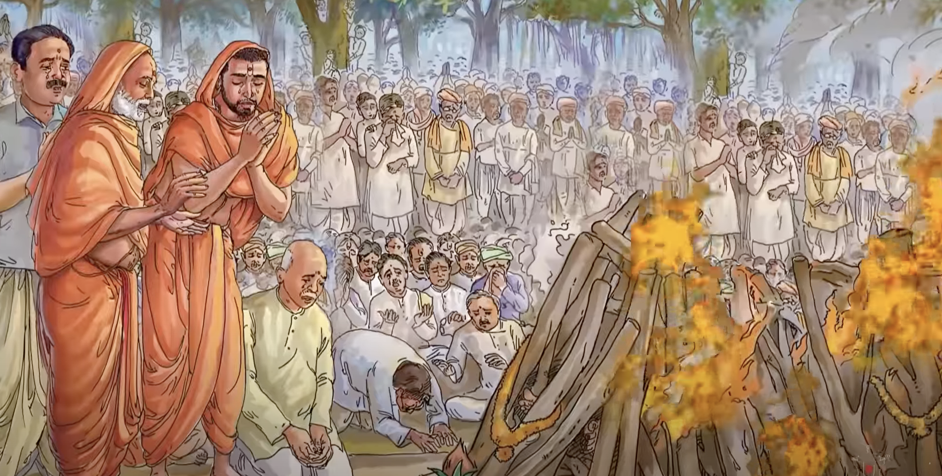 - Keeping a Promise: Not often would you see Swamishri lost in thought. On this particular day in October 1990, Swamishri was visibly so. He requested for some flowers to be kept aside and for a car to be arranged. Nobody knew where Swamishri was planning to go. However, 5 days ago, an ill devotee called Jaykrishna was suffering in hospital and requested Swamishri to carry out his final rites upon his passing. Swamishri arrived at the crematorium before Jaykrishna’s family. Everyone was awestruck to see Swami there. These photographs capture the sentiment that Swamishri has been there for devotees from the time of their birth until even after the time of their death…